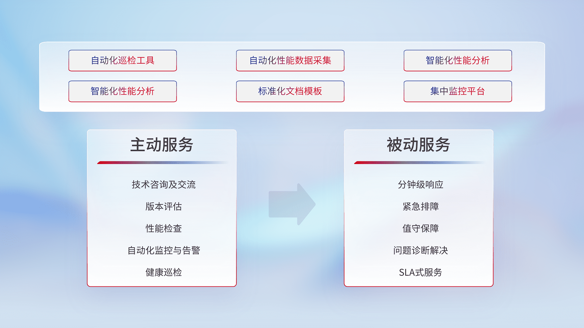 智能化工具和标准化文档,,,保障服务质量,,提供主动服务(包含技术咨询、、版本评估、、性能检查、、、自动化监控与告警、、、、健康巡检)和被动服务包含(分钟级响应、、、、紧急排障、、、值守保障、、问题诊断解决、、SLA服务)。。